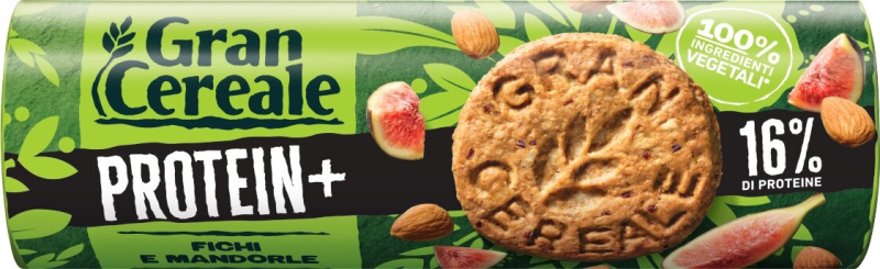 Grancereale protein+: proteinski polnozrnati piškoti z mandlji in figami. Fini pekovski izdelek. Vir beljakovin. Visoka vsebnost prehranske vlaknine. Neto količina: 250 g Sestavine: PŠENIČNA polnozrnata moka 24,4 %*, OVSENI kosmiči, sladkor, sončnično olje, grahove beljakovine, hrustljava žita (PŠENIČNI gluten, riževa moka), hrustljava polnozrnata pira (PŠENICA) (polnozrnata pirina (PŠENICA) moka, sladkor, izvleček JEČMENOVEGA SLADA, sol), MANDLJI 4,1 %*, figova masa 3,9 %*, glukozni sirup, emulgator: lecitini (SOJA), sredstvi za vzhajanje: amonijevi karbonati, natrijevi karbonati; sol, aroma.*% končnega proizvoda. Lahko vsebuje sledi drugih OREŠKOV, MLEKA, GORČICE in JAJC.