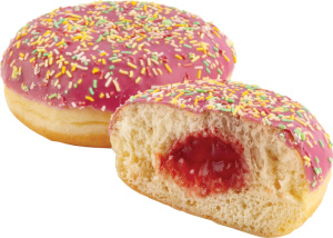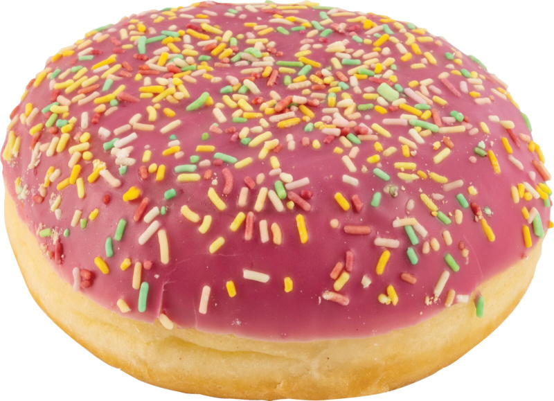 PŠENIČNA moka, jagodno polnilo 20 % [voda, glukozno-fruktozni sirup (iz PŠENICE in koruze), sladkor, jagode 20 %, modificiran škrob, koncentrat korenčkovega soka, koncentrat korenčka, zgoščevalec: pektin, sredstvo za uravnavanje kislosti: citronska kislina; arome, utrjevalec: kalcijev citrat; barvilo: karoteni], voda, palmina mast, jagodni obliv 10 % [sladkor, palmina mast, SIROTKA v prahu (iz MLEKA), posneto MLEKO v prahu, koncentrat sladkega krompirja, koncentrat rdeče pese, koncentrat korenčka, koncentrat redkve, koncentrat češnje, koncentat jabolka, koncentrat paprike, emulgator: lecitini; arome, sredstvo za uravnavanje kislosti: citronska kislina], pisane mrvice 3 % [sladkor, PŠENIČNI škrob, mašččoba palminega jedra, emulgator: SOJIN lecitin, barvila: kurkumin, patentno modro V, karoteni; sredstvo za glaziranje: gumi arabikum, čebelji vosek beli in rumeni], repično olje, kvas, dekstroza ( iz PŠENICE), sladkor, PŠENIČNI škrob, sredstvi za vzhajanje: difosfati, natrijevikarbonati; sol, jajčni beljak v prahu, emulgatorji: mono- in digliceridi maščobnih kislin, gelanski gumi, tartratni mono-in diacetilestri maščobnih kislin; SIROTKA v prahu (iz MLEKA), stabilizatorji: guar gumi, natrijeva karboksimetil celuloza, ksantan gumi; barvilo: karoteni; posneto MLEKO v prahu, ekstrakt žafranike, sredstvo za obdelavo moke: askorbinska kislina; arome.