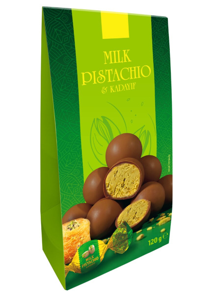 Sladkor, rastlinske maščobe (palmina, karitejeva), sirotka v prahu (iz MLEKA), posneto MLEKO v prahu 4,7 %, maslo (iz MLEKA), kadaif (PŠENIČNA moka, voda, koruzni škrob, sončnično olje, sol), kakavova masa 3 %, kakav v prahu z manj maščobami 2,5 %, PISTACIJE 4,8 %, emulgator (lecitini, SOJINI lecitini), poliglicerol. naravna aroma pistacije z drugimi naravnimi aromami (vsebuje PISTACIJE), sol, LEŠNIKOVA in ARAŠIDOVA pasta, spirulina (ekstrakt spiruline,sončnično olje, trehaloza), aroma, barvilo: kurkumin.