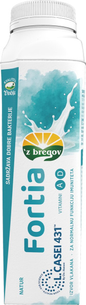 | Ostalo | Jogurt Fortia vsebuje kulturo Lactobacillus casei (L. casei 431™). Vitamina A in D prispevata k normalnemu delovanju imunskega sistema. Uravnotežena in raznolika prehrana ter zdrav način življenja sta izjemno pomembna. Porcija 330 g zagotavlja 50 % priporočenega dnevnega vnosa vitaminov A in D. | |