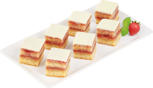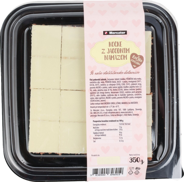 Biskvit (sladkor, PŠENIČNA bela moka, sončnično olje, voda, PŠENIČNI škrob, JAJCA v prahu, emulgatorji (E471, E472b, E477), sredstva za vzhajanje (E450, E500, E341), glukozni sirup, posneto MLEKO v prahu), sadni namaz jagoda (sladkor, jagodna kaša (22 %), voda, jabolčna kaša (8 %), kislina (E330), želirno sredstvo (pektin), zgoščeni sok črnega korena, konzervans (E202), sredstvo proti penjenju (E471)), obliv (sladkor, rastlinska olja in maščobe (palmove, sončnične, sojine, oljne ogrščice), MLEKO v prahu, posneto MLEKO v prahu, emulgator (SOJIN lecitin), arome). Lahko vsebuje sledi OREŠKOV (OREH, LEŠNIK, MANDELJ) in ARAŠIDOV.