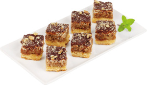 Krhko testo (PŠENIČNA bela moka, margarina (rastlinske maščobe (palmove, kokosova), sončnično olje, voda, emulgator (E471), sol, konzervans (E200), sredstvo za uravnavanje kislosti (E330), aroma), sladkor, PŠENIČNA polnozrnata moka, JAJCA v prahu, voda, aroma (vanilin)), meringa z orehi (OREHI 24 %, sladkor, voda, JAJČNI beljak v prahu, sladkor, sredstva za zgostitev (E415, E413, E401), kislini (E333, E330), sol), sadno polnilo (sladkor, marelična kaša, jabolčna kaša, modificiran škrob (E1422), želirno sredstvo (pektin), sredstvo za uravnavanje kislosti (E330), aroma marelice, konzervans (E202)), obliv (sladkor, popolnoma hidrogenirana rastlinska maščoba (kokosova, palmova jedrca), kakavova masa, rastlinska maščoba (palmova, sončnična), kakavovo maslo, sončnično olje, manj masten kakavov prah, emulgatorja (SOJIN in sončnični lecitin), aroma (vanilin)), OREHI. Lahko vsebuje sledi MLEKA, OREŠKOV (LEŠNIK, MANDELJ) in ARAŠIDOV.