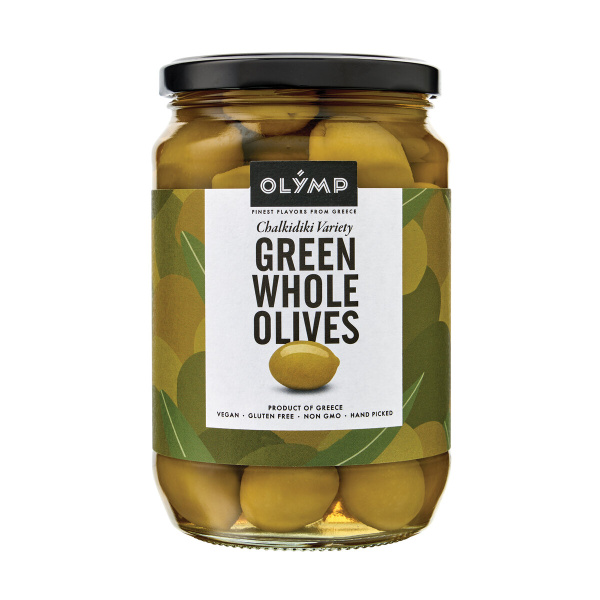 Cele zelene olive, voda, sol, regulator kislosti: citronska kislina, antioksidant: askorbinska kislina.