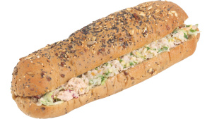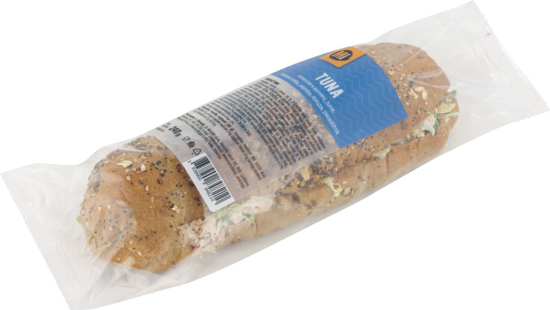 Korenina s semeni 50 % (PŠENIČNA bela moka, voda, mešanica (PŠENICNA moka, PŠENIČNI lepek, posušeno PŠENIČNO kislo testo, sol, sladne moke (JEČMENOVA, RŽENA, PŠENIČNA), RŽENA moka, dekstroza, sredstvo za obdelavo moke: E300), sončnice, mak, lan, ovseni kosmiči, kvas, sol, RŽENI slad, sredstvo za uravnavanje kislosti: E263, sredstvo proti sprijemanju: E170, PŠENIČNA moka, sredstvo za obdelavo moke: E300, posip (sončnice, bučnice, mak, SEZAM, lan, ovseni kosmiči)), TUNA 15 % (TUNA 82 %, sončnično olje, jodirana sol), namaz 15 % (sončnično olje 48 %, voda, kis, sladkor, JAJČNI rumenjaki 3,5 %, modificiran škrob, jodirana sol, GORČICA (voda, GORČIČNA semena, kis, sladkor, jodirana sol), sredstvi za uravnavanje kislosti: E270, E334, konzervansa: E202, E211, sredstvi za zgostitev: E412, E415, aroma (GOR?ICA), antioksidant: E385, barvilo: beta karoten), kitajsko zelje 8,3 %, paprika 5,9 %, koruza 3 %, paradižnik 3 %. Lahko vsebuje sledi MLEKA, OREŠKOV, ZELENE in SOJE.