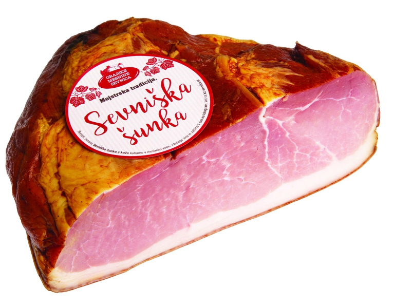Prekajena šunka brez kosti s kožo in slanino, pakirano, cena za kg