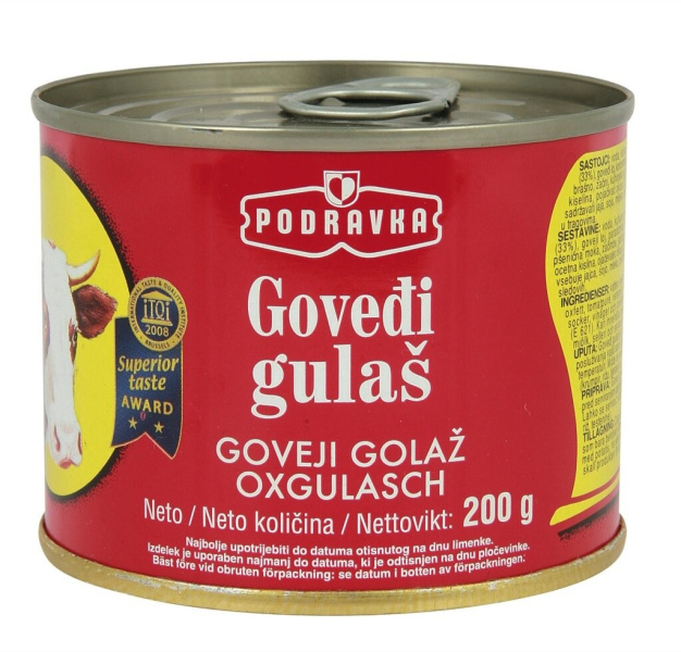 Voda, kuhano goveje meso 33 %, živalske maščobe, paradižnikov koncentrat, PŠENIČNA moka, začimbe, jedilna sol, sladkor, ocetna kislina, ojačevalec okusa (E621).