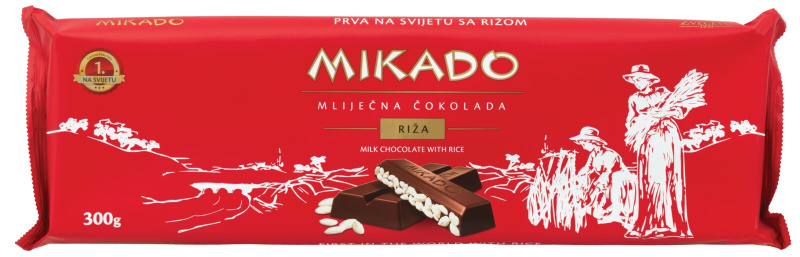 Sladkor, kakavova masa, kakavovo maslo, polnomastno mleko v prahu, ekspandirani riž 10%, emulgator (sojin lecitin), naravna aroma (vanilin). Mlečna čokoladna masa vsebuje: kakavovi deli najmanj 33%, mlečni deli najmanj 14%. Izdelek vsebuje mlečno snov in sojo, lahko vsebuje sledi lešnika, mandlja in gluten.