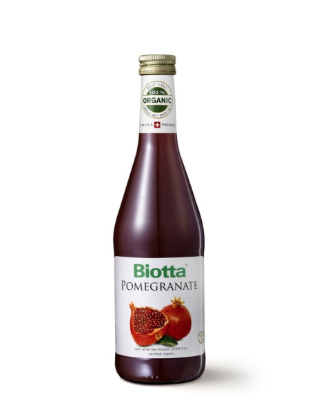 BIOTTA GRANATNO JABOLKO 500 ml, ekološki motni sadni sok, Sestavine: izvleček belega čaja* (1,0 g/l), ekstrakt granatnega jabolka* 27,5 %, koncentrat, agave* 7 %, mešanica sadja 10 % (pire hruške*, aronijin sok*)., *iz kontrolirane ekološke pridelave