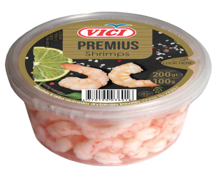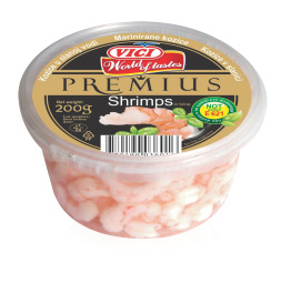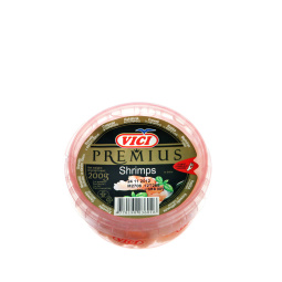 Kozice (Pandalus borealis) - vsebuje SULFITE, in/ali kozice rožnate (Pandalus jordani) - vsebuje SULFUTE, slanica 50 % (voda, sol, regulator kislosti, citronska kislina, konzervans, natrijev benzoat, kalijev sorbat, antioksidant, askorbinska kislina, sladilo, saharin). V SLEDOVIH vsebuje sledi GORČICE, MLEKA/LAKTOZE, ZELENE, MEHKUŽCEV, RIB, JAJC, SOJE, MOKE.