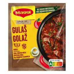 Priprava: 1. Na majhne kocke narežite 500g govejega mesa. 2. Prepražite na žlici vročega sončničnega olja in občasno premešajte. Nato dodajte vodo in kuhajte približno 70minut. 3. Dodajte vsebino vrečke in dobro premešajte. Postopoma dodajajte še približno 600ml vode in vse skupaj kuhajte še 10 minut na zmernem ognju. 4. Servirajte skuhanim krompirjem. Hraniti na suhem.